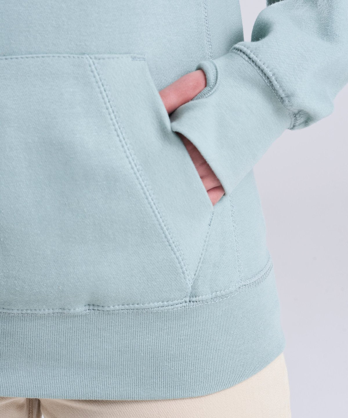 Kangaroo pouch pocket, flat lace draw cords and thumb holes on the cuffs.